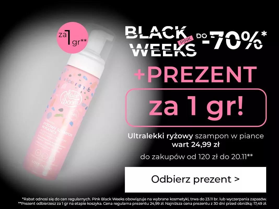 Różowy tydzień pełen niespodzianek! Zadbaj o swoje włosy - podczas PINK Black Weeks odbierz Ultralekki ryżowy szampon w piance Wrażliwy Wielbiciel od HairBoom za 1 grosz. Wystarczy, że zrobisz zakupy od 120 PLN i dodasz prezent w koszyku. Oferta tylko do 20.11!