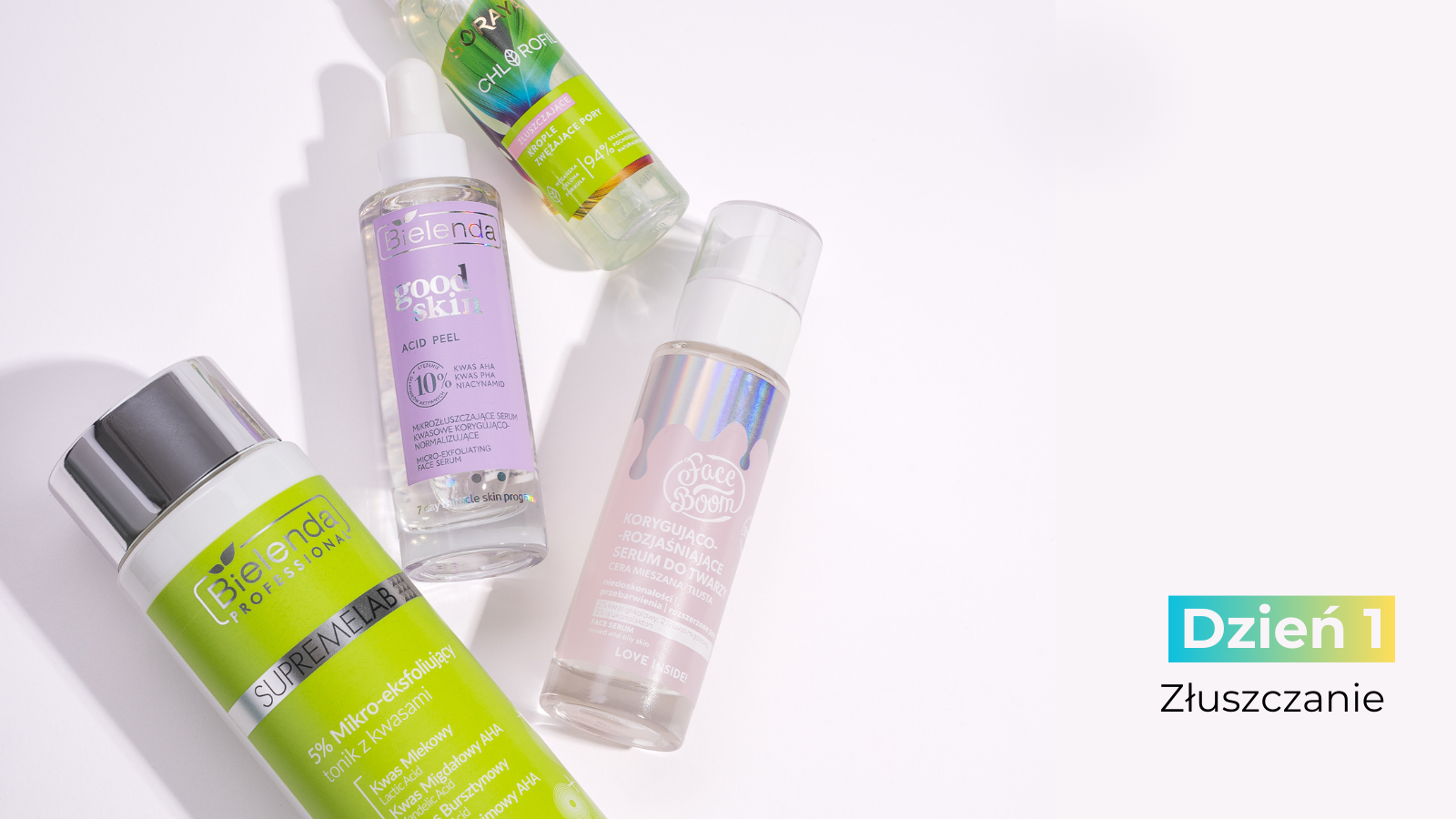 Pierwszy dzień cyklu to złuszczanie za pomocą kwasów AHA lub BHA. Po dokładnym oczyszczeniu cery zastosujcie produkt z kwasami. Możecie użyć peelingu kwasowego, toniku z kwasami, serum lub kremu z kwasami. Złuszczanie usunie martwy naskórek, a dodatkowo wpłynie na poprawę kolorytu cery oraz pobudzi skórę do odnowy. Jeżeli wasza cera jest wrażliwa– zacznijcie od produktów z kwasami w niskich stężeniach i działających delikatniej na skórę, np. kwasu azelainowy czy kwasu migdałowego.
