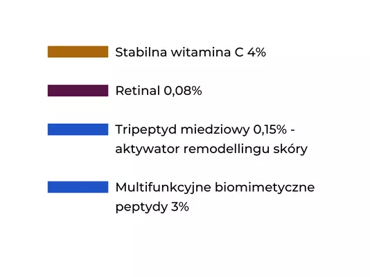 - multifunkcyjne biomimetyczne peptydy – to składniki pobudzające procesy regeneracyjne skóry, wspierające produkcję kolagenu i elastyny, odpowiedzialnych za jędrność i elastyczność skóry.