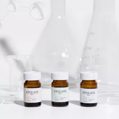 Specjalistyczne monopeelingi X-Foliate basic pozwalają na skomponowanie personalizowanego zabiegu kontrolowanej eksfoliacji kwasowej skóry przy użyciu jednej lub kilku substancji chemicznycho różnej sile działania.