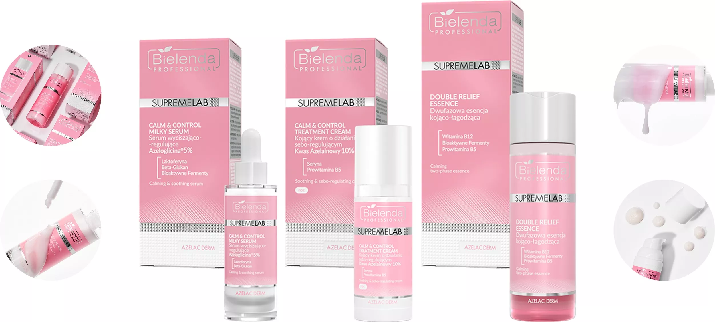 Nowoczesne formuły zostały stworzone tak, aby były komfortowe i odpowiednie dla potrzeb wymagającej skóry – lekkie, mleczne sera, otulające, a jednocześnie nieobciążające kremy oraz dwufazowe emulsje zapewniające zdrowy wygląd i intensywne nawilżenie. Całość wspierają składniki aktywne, takie jak wysokie stężenie kwasu azelainowego (10%), Azeloglicina®, seryna, laktoferyna, witamina B12, beta-glukan, D-panthenol czy bioaktywne fermenty. Razem działają synergicznie, aby redukować niedoskonałości, przyspieszać regenerację, łagodzić wrażliwość i przywracać cerze naturalną równowagę.