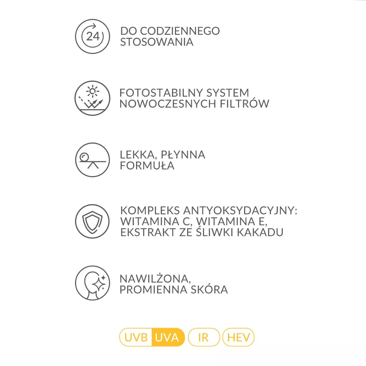 - lekka emulsja ochronna – ona także zapewnia wysoką ochronę przeciwsłoneczną SPF 50, a jednocześnie działa antyoksydacyjnie, opóźniając naturalne procesy starzenia się skóry. Nie obciąża cery i nie zapycha porów.
