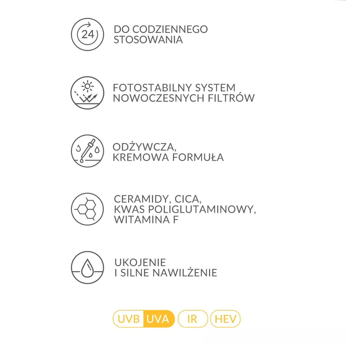 - nawilżający krem ochronny z ceramidami i witaminą F, dla zachowania maksymalnego nawilżenia i odżywienia skóry podatnej na przesuszenie. To krem, który jednocześnie regeneruje i wzmacnia procesy odbudowy skóry. Przeznaczony do stosowania na co dzień. Zawiera filtry SPF 50;
