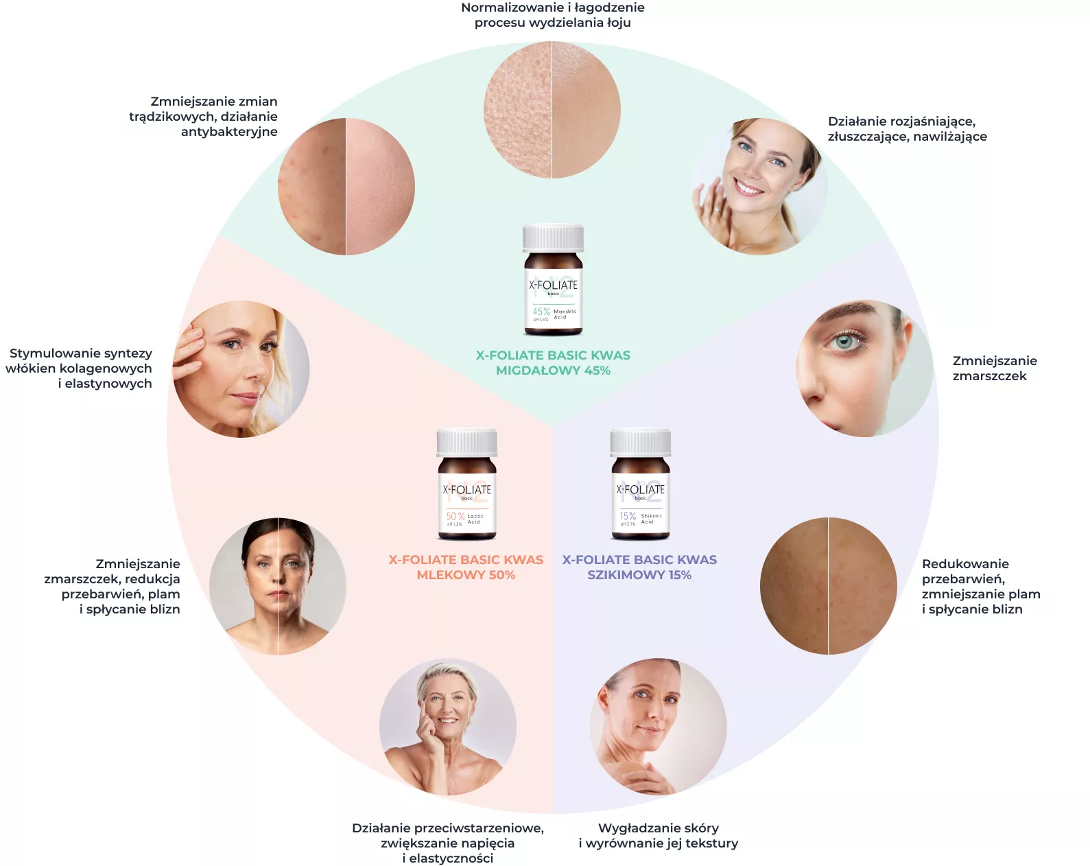 Specjalistyczne monopeelingi X-Foliate basic pozwalają na skomponowanie personalizowanego zabiegu kontrolowanej eksfoliacji kwasowej skóry przy użyciu jednej lub kilku substancji chemicznych o różnej sile działania.